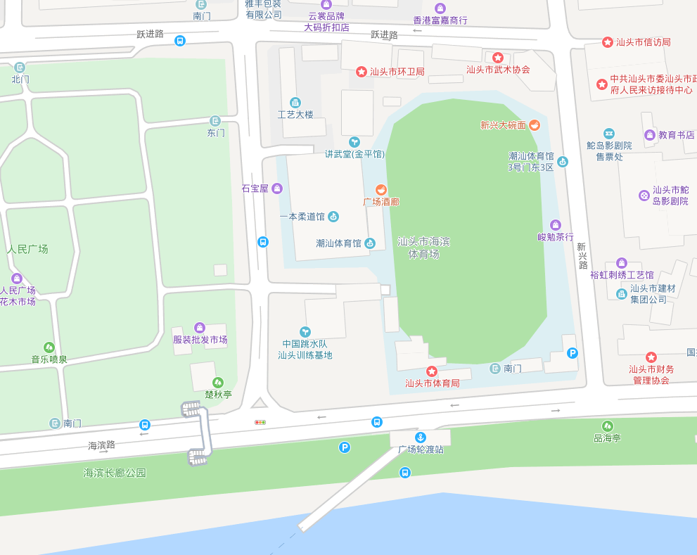 订场运动爱好者可以车停田径场地直停车场,通过跃进路大门进入潮汕馆,入门设有前台供市民朋友们咨询办理租场手续,免费开放田径场跑道通过海滨路进入。